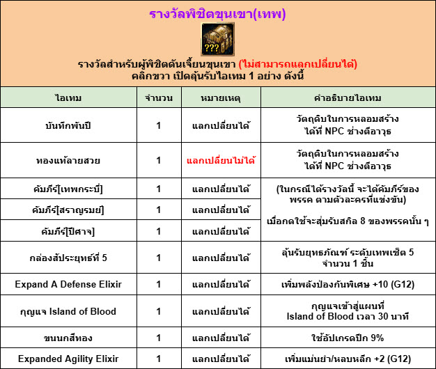 - รางวัลพิชิตขุนเขา 1 กล่อง/คน (กล่องจะดร็อปลงพื้นใต้ตัวละคร ผู้เล่นต้องกดเก็บรางวัลเอง)