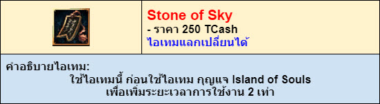- นอกจากนั้นยังมีไอเทมมอล "Stone of Sky" สำหรับใช้เพิ่มระยะเวลากุญแจ ในการเข้าสู่แผนที่ “Island of Souls realms 1 - 6”