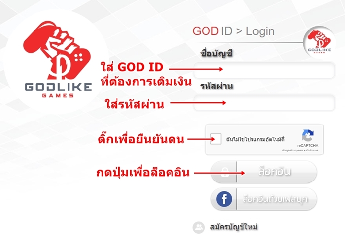 ขั้นตอนที่ 2 - ให้ผู้เล่นทำการล็อกอินไอดี GOD ID ที่ใช้เล่นเกม GODLIKE TwelveSky 2 ซึ่งต้องการเติมเงิน