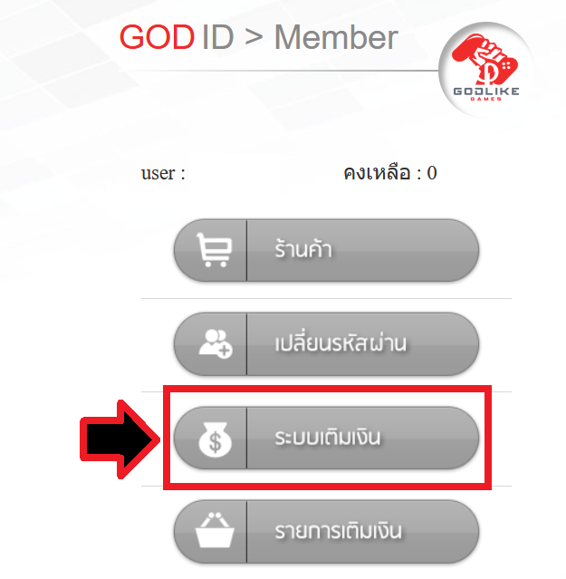 ขั้นตอนที่ 3 - เมื่อเข้าสู่หน้าเมนูของ GOD ID ให้คลิกที่ปุ่ม [ระบบเติมเงิน] เลือกเติมเงินแบบ Razer Gold Pin