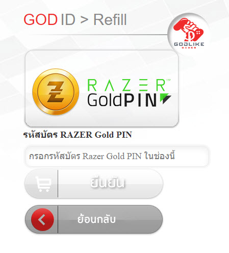 ขั้นตอนที่ 4 - เมื่อเข้าสู่หน้าเติมเงินแบบ Razer Gold Pin จะพบช่องให้กรอกรหัสเติมเงิน ให้ทำการกรอกรหัสเติมเงินทีได้มาลงไปในช่อง แล้วกดปุ่ม "ยืนยัน" เพียงเท่านี้เงิน CASH ก็จะเข้าไอดีของ GOD ID แล้ว