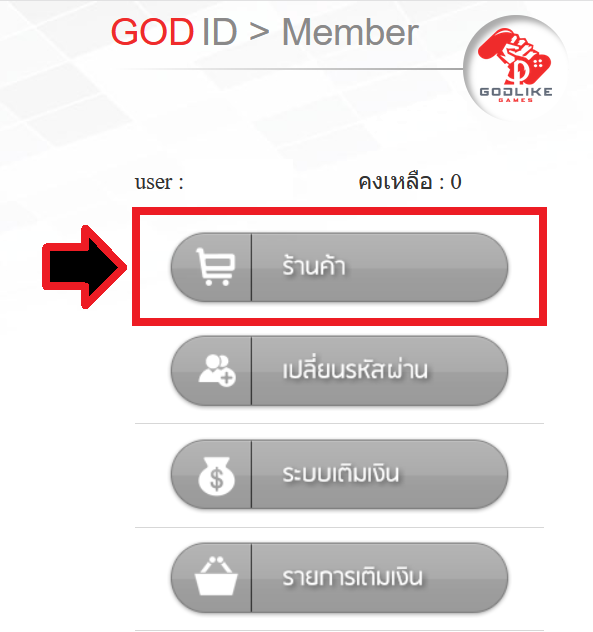 ขั้นตอนที่ 5 - เมื่อเติมเงินเข้า GOD ID แล้ว จากนั้นจะมาถึงขั้นตอนการเติมแคชเข้าเกม GODLIKE TwelveSky 2 โดยคลิกที่ปุ่ม [ร้านค้า]