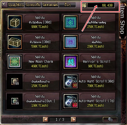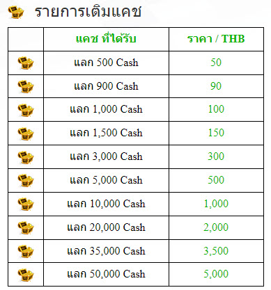 ขั้นตอนที่ 7 - ในหน้าเติมแคช ให้ผู้เล่นเลือกคลิกที่จำนวนแคชที่ต้องการเติม โดยเมื่อคลิกที่จำนวนแคชแล้ว จะเป็นการเติมแคชทันที ! ซึ่งแคชที่เติมจะเข้าในไอดีทันที โดยสามารถดูได้จากร้านค้า Item Shop (ปุ่ม K)