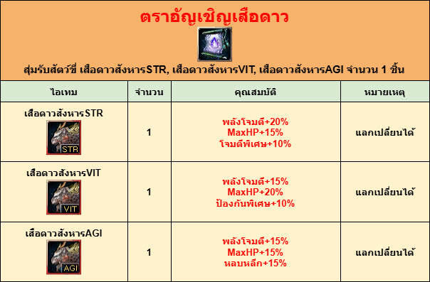 2 - “ตราอัญเชิญเสือดาว” เมื่อกดใช้ จะสุ่มรับพาหนะเสือดาวสังหารพิเศษ แบบใดแบบหนึ่ง ได้แก่ เสือดาวสังหารSTR, เสือดาวสังหารVIT, เสือดาวสังหารAGI ซึ่งมีรายละเอียด ดังนี้