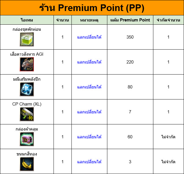 ***หมายเหตุ - คะแนน Premium Point จะมีการรีเซ็ตเป็น 0 ในทุกครั้งที่มีการอัปเดตร้านพรีเมียม (PP Shop) ในครั้งถัดไป โดยทีมงานจะประกาศแจ้งให้ทราบล่วงหน้าก่อนเสมอ