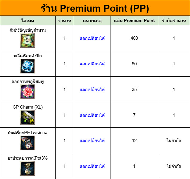 ***หมายเหตุ - คะแนน Premium Point จะมีการรีเซ็ตเป็น 0 ในทุกครั้งที่มีการอัปเดตร้านพรีเมียม (PP Shop) ในครั้งถัดไป โดยทีมงานจะประกาศแจ้งให้ทราบล่วงหน้าก่อนเสมอ