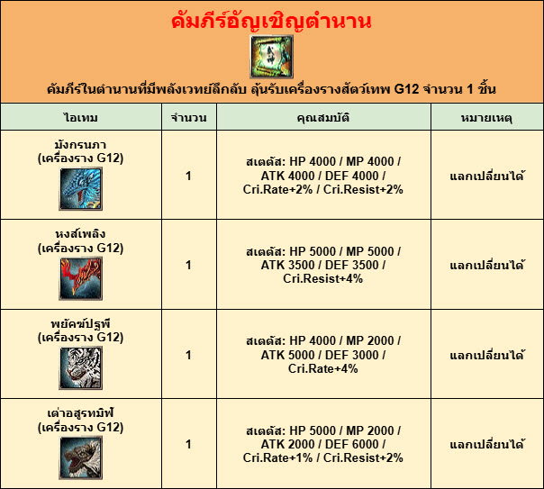 คัมภีร์อัญเชิญตำนาน - เป็นไอเทมพิเศษ ที่เมื่อกดใช้ จะลุ้นรับ 1 ใน 4 เครื่องรางสัตว์เทพ ระดับ G12 จำนวน 1 ชิ้น ซึ่งมีรายละเอียด ดังนี้