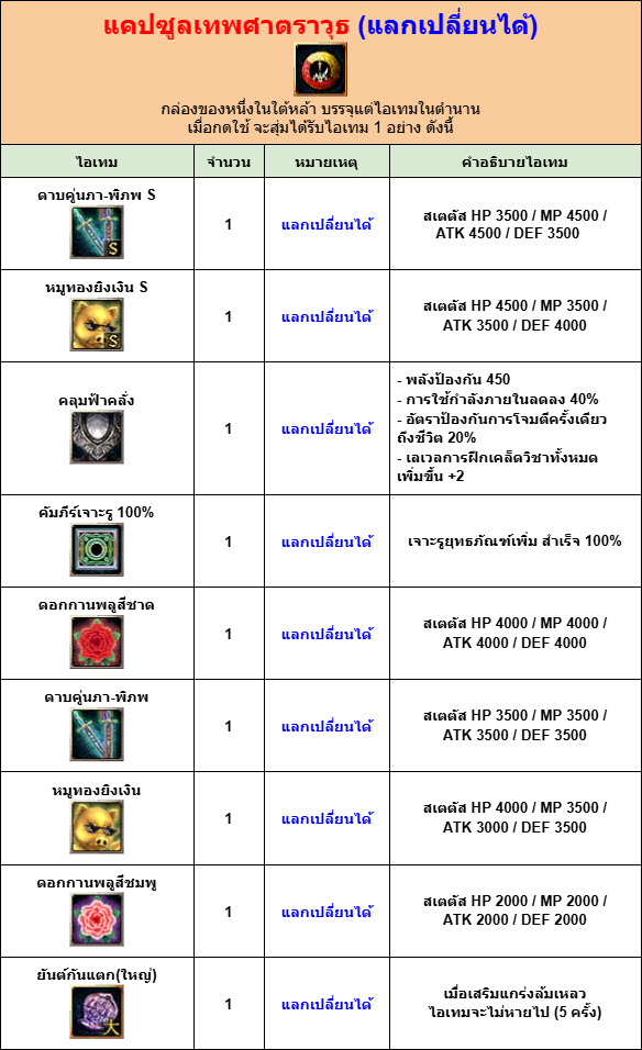 ทั้งนี้ ในส่วนของ “แคปซูลเทพศาตราวุธ” จะเป็นไอเทมพิเศษ ที่เมื่อกดใช้ จะลุ้นรับไอเทมระดับ SSR จำนวน 1 ชิ้น ดังนี้