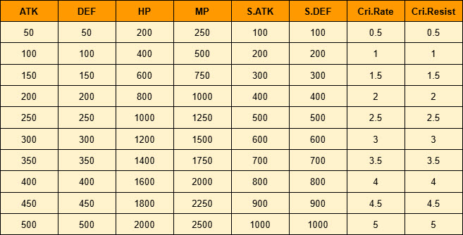 ทั้งนี้ ค่าสถานะที่จะสุ่มได้รับหลังจากการ “เสริมพลัง ผ้าคลุมสัตว์เทพ” จะมีโอกาสสุ่มได้รับค่าใดค่าหนึ่งจากทั้งหมด 80 ค่าสถานะ “ในโอกาสเฉลี่ยเท่า ๆ กัน” ดังนี้