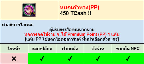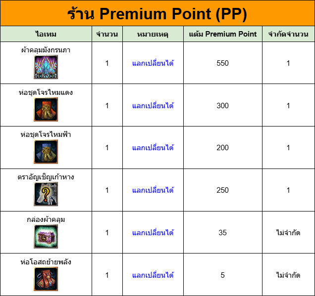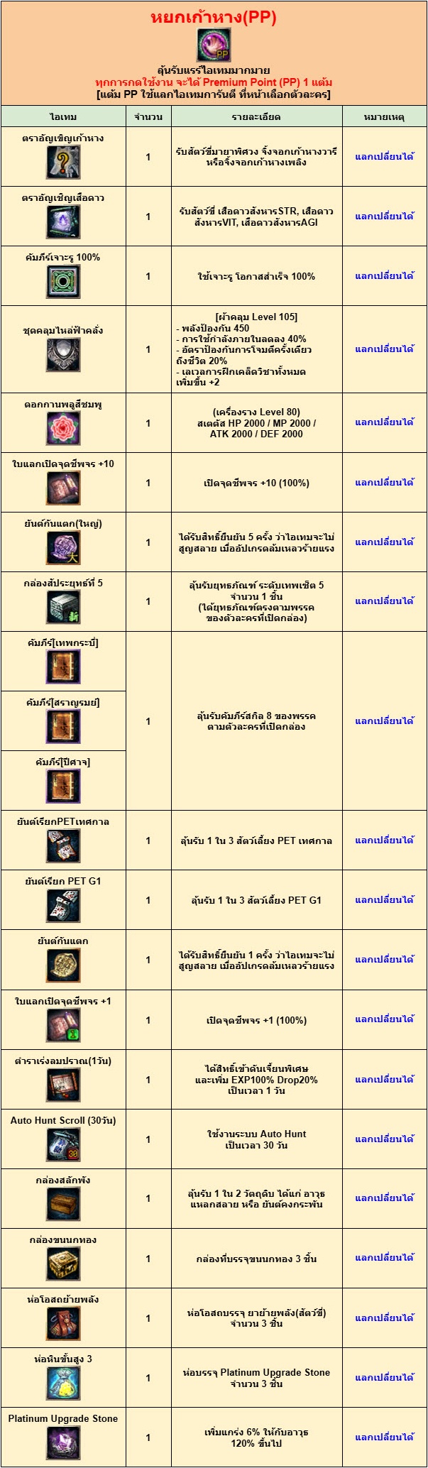 ***หมายเหตุ - คะแนน Premium Point จะมีการรีเซ็ตเป็น 0 ในทุกครั้งที่มีการอัปเดตร้านพรีเมียม (PP Shop) ในครั้งถัดไป โดยทีมงานจะประกาศแจ้งให้ทราบล่วงหน้าก่อนเสมอ