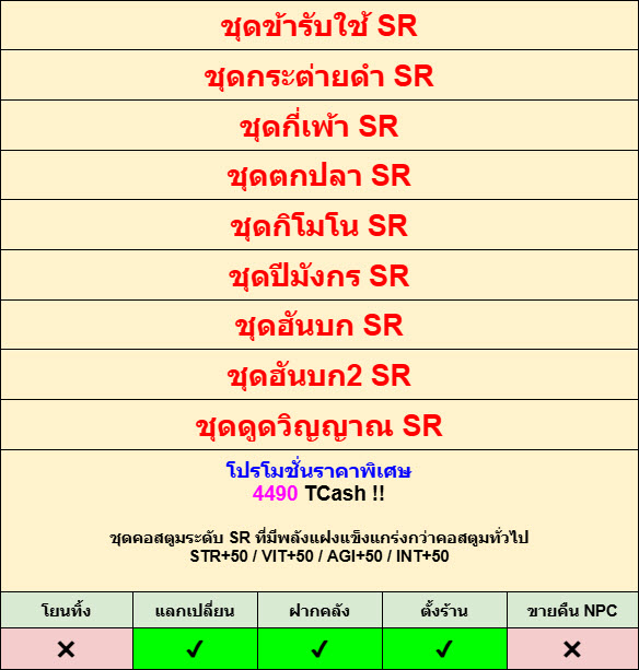 นอกจากนี้!! ทางร้าน Item Shop ยังจัดโปรโมชั่นเด็ด ชุดแฟชั่นระดับ SR ที่อัปเดตมาให้เลือกช้อปกันทุกแบบทุกสไตล์ แถมมาพร้อมราคาพิเศษสุดคุ้มค่า!! เพียง 4490 TCash เท่านั้น~ เหล่าชาวยุทธ์ที่อยากหาชุดแฟชั่นดี ๆ มาใส่เพิ่มความเท่ พร้อมเสริมสเตตัสพิเศษ ก็รีบเข้าไปช้อปปิ้งกันได้เลย