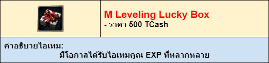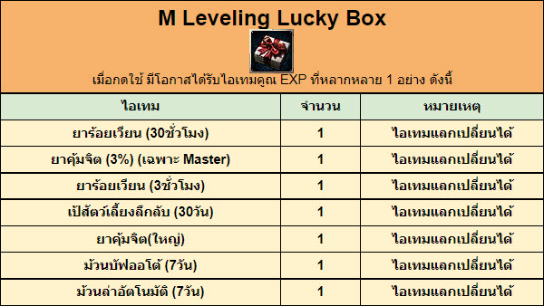 - อัปเดตไอเทมมอลใหม่ M Leveling Lucky Box