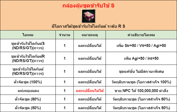 นอกจากนั้นยังมาพร้อม New Item Mall ใหม่ “กล่องลุ้นชุดข้ารับใช้ S” ที่ภายในกล่องมีคอสตูมชุดข้ารับใช้ระดับต่าง ๆ ทั้ง S, R และแบบปกติ รวมไปถึงไอเทมตั๋วจัดชุด(80%)(50%) กับแท่งทองแดง ให้ได้ลุ้นกัน ซึ่งบอกเลยว่าชุดคอสตูมทั้งระดับ S และ R จะมีความพิเศษตรงบวกเพิ่มข้อสถานะให้กับตัวละคร โดยระดับ S จะเพิ่ม [Str+50 / Vit+50 / Agi+50] และในส่วนระดับ R จะเพิ่ม [Agi+50 / Int+50] ดังนั้น ใครที่อยากได้ ก็เตรียมตัวรอช้อปปิ้งไปเปิดลุ้นรับกันได้เลย