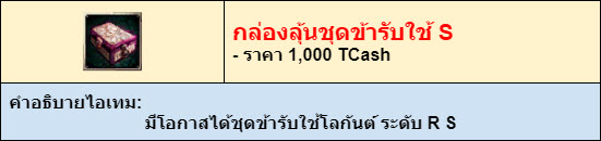 - อัปเดตไอเทมมอลลิมิเต็ด: กล่องลุ้นชุดข้ารับใช้ S